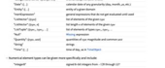 "MachineInteger" machine-sized integers "MachineReal" machine-sized reals "Boolean" Boolean (True or False) "ByteArray" ByteArray elements representing binary data "Categorical"::[categories] encoded by categories "CategoricalOrdered"::[categories] ordinal categories (with order) "Date"::[…] calendar date of any granularity (day, month, μs, etc.) "Entity"::[…] entity of a given domain "GeoPosition"::[…] geo position in any datum or geo model "InertExpression" general expressions that do not get evaluated until used "ListVector"::[type] list of elements of the given type "ListVector"::[type,n] list length n of elements of the given type "ListTuple"::[type1,type2,…] list of elements of types type1, type2, … "Null" Missing expression "Quantity"::[type,unit] quantities of type magnitude and common unit "String" strings "Time"::[…] time of day, as in TimeObject - Numerical element types can be given more specifically and include:
