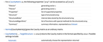 "XVector" generating vector x "YVector" generating vector y "Properties" list of supported properties "Structure" type of structured array "StructuredData" internal data stored by the structured array "StructuredAlgorithms" list of functions with special methods for the structured array "Summary" summary information, represented as a Dataset - Normal[CauchyMatrix[x]] gives the Cauchy matrix as an ordinary matrix.