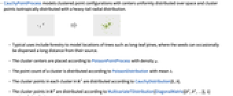 - CauchyPointProcess models clustered point configurations with centers uniformly distributed over space and cluster points isotropically distributed with a heavy-tail radial distribution.
