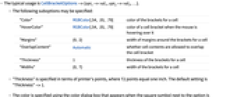 "Color" RGBColor[.54, .55, .79] color of the brackets for a cell "HoverColor" RGBColor[.54, .55, .79] color of a cell bracket when the mouse is hovering over it "Margins" {0, 2} width of margins around the brackets for a cell "OverlapContent" Automatic whether cell contents are allowed to overlap the cell bracket "Thickness" 1 thickness of the brackets for a cell "Widths" {0, 7} width of the brackets for a cell - "Thickness" is specified in terms of printer’s points, where 72 points equal one inch. The default setting is "Thickness"->1.