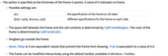 dist the specification of the frame on all sides {{left,right},{bottom,top}} different specifications for the frame on each side - The space left between the frame and the cell contents is determined by CellFrameMargins. The color of the frame is determined by CellFrameColor.
