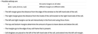 m the same margins on all sides {{left,right},{bottom,top}} different margins on different sides - The left margin gives the distance from the edge of the window to the left‐hand side of the cell.