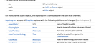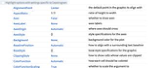 AlignmentPoint Center the default point in the graphic to align with AspectRatio 1/3 ratio of height to width Axes False whether to draw axes AxesLabel None axes labels AxesOrigin Automatic where axes should cross AxesStyle {} style specifications for the axes Background None background color for the plot BaselinePosition Automatic how to align with a surrounding text baseline BaseStyle {} base style specifications for the graphic ClippingStyle None how to show cells whose values are clipped ColorFunction Automatic how each cell should be colored ColorFunctionScaling True whether to scale the argument to ColorFunction ColorRules Automatic rules for determining colors from values ContentSelectable Automatic whether to allow contents to be selected CoordinatesToolOptions Automatic detailed behavior of the coordinates tool DataRange Automatic the range of