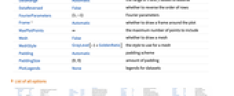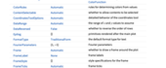 values to assume DataReversed False whether to reverse the order of rows FourierParameters {1,-1} Fourier parameters Frame Automatic whether to draw a frame around the plot MaxPlotPoints ∞ the maximum number of points to include Mesh False whether to draw a mesh MeshStyle GrayLevel[-1+GoldenRatio] the style to use for a mesh Padding Automatic padding scheme PaddingSize {0,0} amount of padding PlotLegends None legends for datasets -
