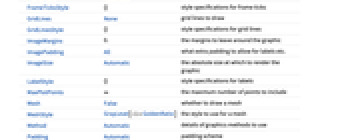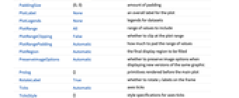 values to assume DataReversed False whether to reverse the order of rows Epilog {} primitives rendered after the main plot FormatType TraditionalForm the default format type for text FourierParameters {1,-1} Fourier parameters Frame Automatic whether to draw a frame around the plot FrameLabel None frame labels FrameStyle {} style specifications for the frame FrameTicks Automatic frame ticks FrameTicksStyle {} style specifications for frame ticks GridLines None grid lines to draw GridLinesStyle {} style specifications for grid lines ImageMargins 0. the margins to leave around the graphic ImagePadding All what extra padding to allow for labels etc. ImageSize Automatic the absolute size at which to render the graphic LabelStyle {} style specifications for labels MaxPlotPoints ∞ the maximum number of points to include Mesh False whether to draw a mesh MeshStyle GrayLevel[-1+GoldenRatio] the style to use for a mesh Method Automatic details of graphics methods to use Padding Automatic padding scheme PaddingSize {0,0} amount of padding PlotLabel None an overall label for the plot PlotLegends None legends for datasets PlotRange All range of values to include PlotRangeClipping False whether to clip at the plot range PlotRangePadding Automatic how much to pad the range of values PlotRegion Automatic the final display region to be filled PreserveImageOptions Automatic whether to preserve image options when displaying new versions of the same graphic Prolog {} primitives rendered before the main plot RotateLabel True whether to rotate y labels on the frame Ticks Automatic axes ticks TicksStyle {} style specifications for axes ticks