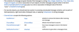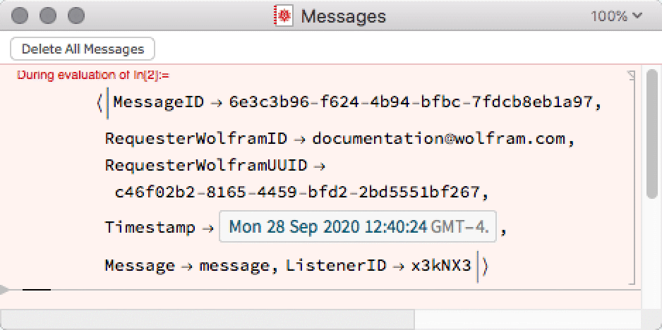 "Message" contents of the message "MessageID" unique message ID "Timestamp" server timestamp for the message "RequesterWolframID" Wolfram ID of the sender "RequesterWolframUUID" Wolfram UUID of the sender "ListenerID" ID of the current listener - The contents of a message are given literally if the message is a string, Real, Integer, ByteArray, True, False, Null, Image or Image3D, or a list or association of such objects. All other messages are given either in the form HoldComplete[DisableFormatting[expr]] or as a list or association of delayed rules of the form "name"DisableFormatting[val].