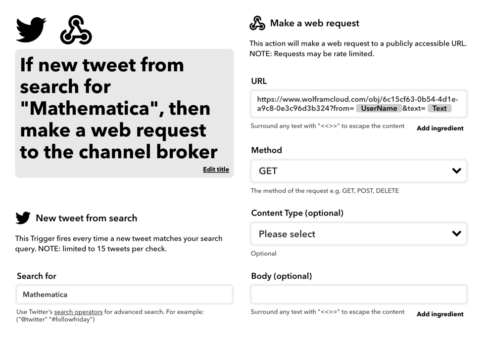 Create an IFTTT applet that tracks mentions of the word "Mathematica" on Twitter and sends them to the APIFunction via HTTP: