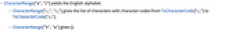 - CharacterRange["c1","c2"] gives the list of characters with character codes from ToCharacterCode["c1"] to ToCharacterCode["c2"].