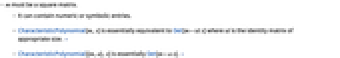- CharacteristicPolynomial[m,x] is essentially equivalent to Det[m-id x] where id is the identity matrix of appropriate size. »