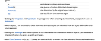 s explicit size in ordinary plot coordinates Scaled[s] size given as a fraction of the chart element region Automatic size determined by the original aspect ratio of g All size that fills the chart element region - Settings for ImageSize and AspectRatio in g are ignored when rendering chart elements, except when w or h is Automatic.