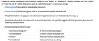 "Description" short textual description of the property "Interval" uncertainty range given by Interval[…] "LongDescription" longer textual description of the property "Note" additional information about the property "Units" units in which the value is given "Conditions" conditions under which the property was measured "UnitsName" English name for the units used "UnitsNotation" notation for the units used "UnitsStandardName" Wolfram Language standard name for the units used "Value" property value (default if no annotation is specified) - ChemicalData[{"name","Compound"}] gives a list of available chemicals that contain the element with the specified name.