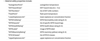 "AutoignitionPoint" autoignition temperature "DOTHazardClass" DOT hazard class (0.x - 9.x) "DOTNumbers" list of DOT (UN) numbers "FlashPoint" flash point temperature "LowerExplosiveLimit" lower explosive air concentration fraction "NFPAFireRating" NFPA flammability (red) rating (0-4) "NFPAHazards" list of specific NFPA hazard tags "NFPAHealthRating" NFPA health (blue) rating (0-4) "NFPALabel" image of NFPA label "NFPAReactivityRating" NFPA reactivity (yellow) rating (0-4) "RTECSClasses" list of RTECS classes "UpperExplosiveLimit" upper explosive air concentration fraction - Properties applicable mainly to amino acids include: