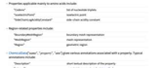 "Codons" list of nucleotide triplets "IsoelectricPoint" isoelectric point "SideChainLogAcidityConstant" side-chain acidity constant - Region-related properties include: