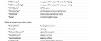 "ColorStructureDiagram" 2D bond connectivity diagram "FormattedName" common name in formatted form "Formula" molecular formula in display form "FormulaString" molecular formula as a string "HillFormula" compound formula in Hill order for display "HillFormulaString" compound formula in Hill order as a string "IUPACName" IUPAC name "Memberships" entity classes containing chemical "MolarMass" molar mass in grams per mole "Name" common English name - Basic physical properties include: