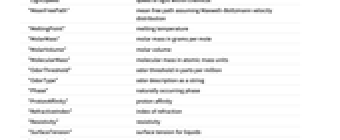"BoilingPoint" boiling temperature "Density" density "DielectricConstant" dielectric constant "DipoleMoment" dipole moment "ElectronAffinity" electron affinity "LightSpeed" speed of light within chemical "MeanFreePath" mean free path assuming Maxwell-Boltzmann velocity distribution "MeltingPoint" melting temperature "MolarMass" molar mass in grams per mole "MolarVolume" molar volume "MolecularMass" molecular mass in atomic mass units "OdorThreshold" odor threshold in parts per million "OdorType" odor description as a string "Phase" naturally occurring phase "ProtonAffinity" proton affinity "RefractiveIndex" index of refraction "Resistivity" resistivity "SurfaceTension" surface tension for liquids "VaporDensity" density relative to air density "VaporPressure" vapor pressure "Viscosity" dynamic viscosity - Thermal properties include: