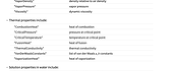 "CombustionHeat" heat of combustion "CriticalPressure" pressure at critical point "CriticalTemperature" temperature at critical point "FusionHeat" heat of fusion "ThermalConductivity" thermal conductivity "VanDerWaalsConstants" list of van der Waals