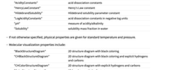 "AcidityConstants" acid dissociation constants "HenryLawConstant" Henry's Law constant "HildebrandSolubility" Hildebrand solubility parameter constant "LogAcidityConstants" acid dissociation constants in negative log units "pH" measure of acidity/alkalinity "Solubility" solubility mass fraction in water - If not otherwise specified, physical properties are given for standard temperature and pressure.