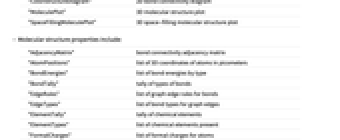 "BlackStructureDiagram" 2D structure diagram with black coloring "CHBlackStructureDiagram" 2D structure diagram with black coloring and explicit hydrogens and carbons "CHColorStructureDiagram" 2D structure diagram with explicit hydrogens and carbons "ColorStructureDiagram" 2D bond connectivity diagram "MoleculePlot" 3D molecular structure plot "SpaceFillingMoleculePlot" 3D space-filling molecular structure plot - Molecular structure properties include: