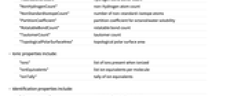 "ElementMassFraction" elemental composition by mass fraction "HBondAcceptorCount" hydrogen bond acceptor count "HBondDonorCount" hydrogen bond donor count "NonHydrogenCount" non-hydrogen atom count "NonStandardIsotopeCount" number of non-standard-isotope atoms "PartitionCoefficient" partition coefficient for octanol/water solubility "RotatableBondCount" rotatable bond count "TautomerCount" tautomer count "TopologicalPolarSurfaceArea" topological polar surface area - Ionic properties include: