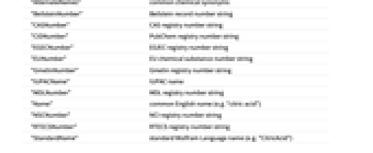 "AlternateNames" common chemical synonyms "BeilsteinNumber" Beilstein record number string "CASNumber" CAS registry number string "CIDNumber" PubChem registry number string "EGECNumber" EG/EC registry number string "EUNumber" EU chemical substance number string "GmelinNumber" Gmelin registry number string "IUPACName" IUPAC name "MDLNumber" MDL registry number string "Name" common English name (e.g. "citric acid") "NSCNumber" NCI registry number string "RTECSNumber" RTECS registry number string "StandardName" standard Wolfram Language name (e.g. "CitricAcid") - Material safety properties include: