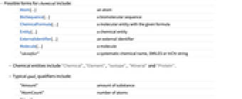 Atom[…] an atom BioSequence[…] a biomolecular sequence ChemicalFormula[…] a molecular entity with the given formula Entity[…] a chemical entity ExternalIdentifier[…] an external identifier Molecule[…] a molecule "identifier" a systematic chemical name, SMILES or InChI string - Chemical entities include "Chemical", "Element", "Isotope", "Mineral" and "Protein".