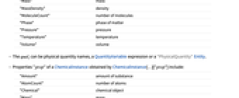 "Amount" amount of substance "AtomCount" number of atoms "Mass" mass "MassDensity" density "MoleculeCount" number of molecules "Phase" phase of matter "Pressure" pressure "Temperature" temperature "Volume" volume - The quali can be physical quantity names, a QuantityVariable expression or a "PhysicalQuantity" Entity.