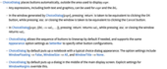- ChoiceDialog by default puts up a notebook with a typical choice dialog appearance. The option settings include WindowFloating->False, WindowSize->All, and WindowTitle->None.
