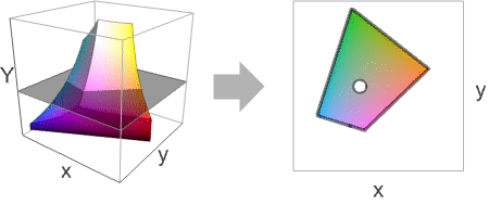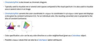 - ChromaticityPlot converts the color coordinates in colspace to coordinates in refcolspace color space and displays a slice given by constant luminance 0.01. For an individual color, the resulting converted color is projected to the slice of constant luminance.