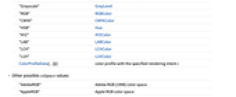 "Grayscale" GrayLevel "RGB" RGBColor "CMYK" CMYKColor "HSB" Hue "XYZ" XYZColor "LAB" LABColor "LCH" LCHColor "LUV" LUVColor ColorProfileData[…][i] color profile with the specified rendering intent