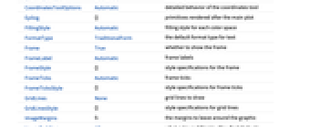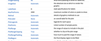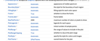 AlignmentPoint Center the default point in the graphic to align with Appearance Automatic appearance of visible spectrum AspectRatio Automatic ratio of height to width Axes False whether to draw axes AxesLabel None axes labels AxesOrigin Automatic where axes should cross AxesStyle {} style specifications for the axes Background None background color for the plot BaselinePosition Automatic how to align with a surrounding text baseline BaseStyle {} base style specifications for the graphic BoundaryStyle Automatic the style for the boundary of each region ContentSelectable Automatic whether to allow contents to be selected CoordinatesToolOptions Automatic detailed behavior of the coordinates tool Epilog {} primitives rendered after the main plot FillingStyle Automatic filling style for each color space FormatType TraditionalForm the default format type for text Frame True whether to show the frame FrameLabel Automatic frame labels FrameStyle {} style specifications for the frame FrameTicks Automatic frame ticks FrameTicksStyle {} style specifications for frame ticks GridLines None grid lines to draw GridLinesStyle {} style specifications for grid lines ImageMargins 0. the margins to leave around the graphic ImagePadding All what extra padding to allow for labels etc. ImageSize Automatic the absolute size at which to render the graphic LabelStyle {} style specifications for labels MaxPlotPoints 2000 maximum number of colors or pixels to show Method Automatic details of graphics methods to use PlotLabel None an overall label for the plot PlotLegends Automatic legends for each space PlotPoints Automatic initial number of sample points PlotRange Automatic the range of values to include in the plot PlotRangeClipping True whether to clip at the plot range PlotRangePadding Automatic how much to pad the range of values PlotRegion Automatic the final display region to be filled PlotStyle Automatic specify the style for colors and images PlotTheme $PlotTheme overall theme for the plot PreserveImageOptions Automatic whether to preserve image options when displaying new versions of the same graphic Prolog {} primitives rendered before the main plot RotateLabel True whether to rotate y labels on the frame Ticks Automatic axes ticks TicksStyle {} style specifications for axes ticks WhitePoint Automatic what white point to show