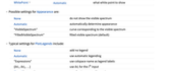 None do not show the visible spectrum Automatic automatically determine appearance "VisibleSpectrum" curve corresponding to the visible spectrum "FilledVisibleSpectrum" filled visible spectrum (default) - Typical settings for PlotLegends include: