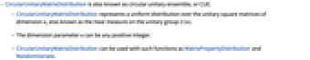 - CircularUnitaryMatrixDistribution is also known as circular unitary ensemble, or CUE.