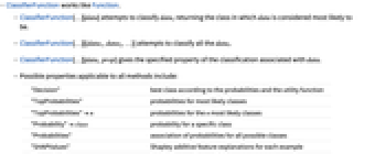 - ClassifierFunction[…][data,prop] gives the specified property of the classification associated with data.