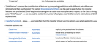 "Decision" best class according to the probabilities and the utility function "TopProbabilities" probabilities for most likely classes "TopProbabilities"n probabilities for the n most likely classes "Probability"class probability for a specific class "Probabilities" association of probabilities for all possible classes "SHAPValues" Shapley additive feature explanations for each example "Properties" list of all properties available - "SHAPValues" assesses the contribution of features by comparing predictions with different sets of features removed and then synthesized. The option MissingValueSynthesis can be used to specify how the missing features are synthesized. SHAP explanations are given as odds ratio multipliers with respect to the class training prior. "SHAPValues"n can be used to control the number of samples used for the numeric estimations of SHAP explanations.