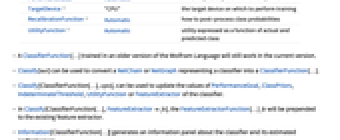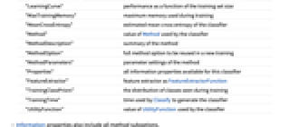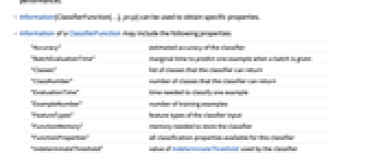 "Accuracy" estimated accuracy of the classifier "BatchEvaluationTime" marginal time to predict one example when a batch is given "Classes" list of classes that the classifier can return "ClassNumber" number of classes that the classifier can return "EvaluationTime" time needed to classify one example "ExampleNumber" number of training examples "FeatureTypes" feature types of the classfier input "FunctionMemory" memory needed to store the classifier "FunctionProperties" all classification properties available for this classifier "IndeterminateThreshold" value of IndeterminateThreshold used by the classifier "LearningCurve" performance as a function of the training set size "MaxTrainingMemory" maximum memory used during training "MeanCrossEntropy" estimated mean cross entropy of the classifier "Method" value of Method used by the classifier "MethodDescription" summary of the method "MethodOption" full method option to be reused in a new training "MethodParameters" parameter settings of the method "Properties" all information properties available for this classifier "FeatureExtractor" feature extractor as FeatureExtractorFunction "TrainingClassPriors" the distribution of classes seen during training "TrainingTime" time used by Classify to generate the classifier "UtilityFunction" value of UtilityFunction used by the classifier - Information properties also include all method suboptions.