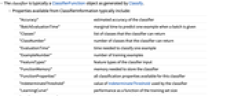 "Accuracy" estimated accuracy of the classifier "BatchEvaluationTime" marginal time to predict one example when a batch is given "Classes" list of classes that the classifier can return "ClassNumber" number of classes that the classifier can return "EvaluationTime" time needed to classify one example "ExampleNumber" number of training examples "FeatureTypes" feature types of the classfier input "FunctionMemory" memory needed to store the classifier "FunctionProperties" all classification properties available for this classifier "IndeterminateThreshold" value of IndeterminateThreshold used by the classifier "LearningCurve" performance as a function of the training set size "MaxTrainingMemory" maximum memory used during training "MeanCrossEntropy" estimated mean cross entropy of the classifier "Method" value of Method used by the classifier "MethodDescription" summary of the method "MethodOption" full method option to be reused in a new training "Properties" all information properties available for this classifier "TrainingTime" time used by Classify to generate the classifier "UtilityFunction" value of UtilityFunction used by the classifier