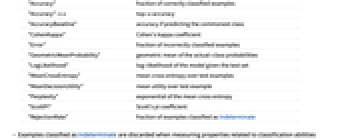 "Accuracy" fraction of correctly classified examples "Accuracy"n top-n accuracy "AccuracyBaseline" accuracy if predicting the commonest class "CohenKappa" Cohen's kappa coefficient "Error" fraction of incorrectly classified examples "GeometricMeanProbability" geometric mean of the actual-class probabilities "LogLikelihood" log-likelihood of the model given the test set "MeanCrossEntropy" mean cross entropy over test examples "MeanDecisionUtility" mean utility over test example "Perplexity" exponential of the mean cross entropy "ScottPi" Scott's pi coefficient "RejectionRate" fraction of examples classified as Indeterminate - Examples classified as Indeterminate are discarded when measuring properties related to classification abilities on the test set, such as "Accuracy", "Error" or "MeanCrossEntropy".