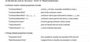 "ConfusionMatrix" counts cij of class i examples classified as class j "ConfusionMatrixPlot" plot of the confusion matrix "ConfusionMatrixPlot"{c1,c2,…} confusion matrix plot restricted to classes c1, c2, etc. "ConfusionMatrixPlot"n confusion matrix plot for the worst n-class subset "ConfusionFunction" function giving confusion matrix values "TopConfusions" pairs of classes that are most confused "TopConfusions"n n most confused class pairs - Timing-related properties include: