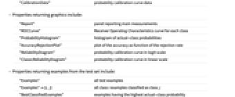 "Report" panel reporting main measurements "ROCCurve" Receiver Operating Characteristics curve for each class "ProbabilityHistogram" histogram of actual-class probabilities "AccuracyRejectionPlot" plot of the accuracy as function of the rejection rate "ReliabilityDiagram" probability calibration curve in logit scale "ClassicReliabilityDiagram" probability calibration curve in linear scale - Properties returning examples from the test set include: