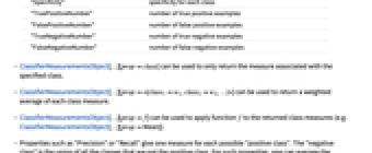 "AreaUnderROCCurve" area under the ROC curve for each class "ClassMeanCrossEntropy" mean cross entropy for each class "ClassRejectionRate" rejection rate for each class "F1Score" F1 score for each class "FalseDiscoveryRate" false discovery rate for each class "FalseNegativeRate" false negative rate for each class "FalsePositiveRate" false positive rate for each class "MatthewsCorrelationCoefficient" Matthews correlation coefficient for each class "NegativePredictiveValue" negative predictive value for each class "Precision" precision of classification for each class "Recall" recall rate of classification for each class "Specificity" specificity for each class "TruePositiveNumber" number of true positive examples "FalsePositiveNumber" number of false positive examples "TrueNegativeNumber" number of true negative examples "FalseNegativeNumber" number of false negative examples - ClassifierMeasurementsObject[…][propclass] can be used to only return the measure associated with the specified class.