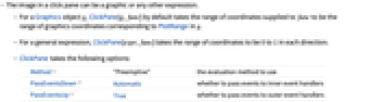 - For a Graphics object g, ClickPane[g,func] by default takes the range of coordinates supplied to func to be the range of graphics coordinates corresponding to PlotRange in g.