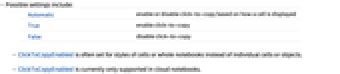 Automatic enable or disable click-to-copy based on how a cell is displayed True enable click-to-copy False disable click-to-copy - ClickToCopyEnabled is often set for styles of cells or whole notebooks instead of individual cells or objects.