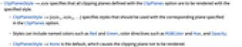 - ClipPlanesStyle->style specifies that all clipping planes defined with the ClipPlanes option are to be rendered with the specified style.