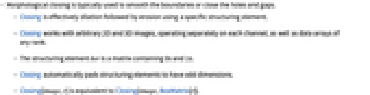 - Closing works with arbitrary 2D and 3D images, operating separately on each channel, as well as data arrays of any rank.