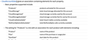 - CloudAccountData[] gives an association containing elements for each property.