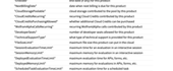 "Product" name of the product "Plan" name of the purchase or usage plan "StartDate" start date for this product "EndDate" end date (if any) for this product "NextBillingDate" date when next billing is due for this product "CloudStoragePoolable" cloud storage contributed to the pool by this product "CloudCreditsRecurring" recurring Cloud Credits contributed by this product "CloudCreditsPurchasingAllowed" whether additional Cloud Credits can be purchased "WolframAlphaCallsRecurring" recurring Wolfram|Alpha calls contributed by this product "DeveloperSeats" number of developer seats allowed for this product "TechnicalSupportType" what type of technical support is provided for this product "FileSizeLimit" maximum file size this product can put in the cloud "SessionEvaluationTimeLimit" maximum time for an evaluation in an interactive session "SessionMemoryLimit" maximum memory for evaluation in an interactive session "DeployedEvaluationTimeLimit" maximum evaluation time for APIs, forms, etc. "DeployedMemoryLimit" maximum memory for evaluations in APIs, forms, etc. "ScheduledTaskEvaluationTimeLimit" maximum evaluation time for a scheduled task "ScheduledTaskMemoryLimit" maximum memory for a scheduled task - CloudAccountData also supports the following option:
