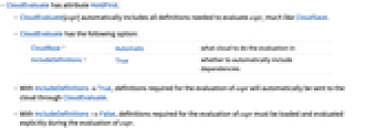 CloudBase Automatic what cloud to do the evaluation in IncludeDefinitions True whether to automatically include dependencies - With IncludeDefinitionsTrue, definitions required for the evaluation of expr will automatically be sent to the cloud through CloudEvaluate.