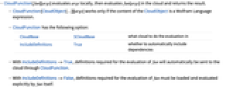 CloudBase $CloudBase what cloud to do the evaluation in IncludeDefinitions True whether to automatically include dependencies - With IncludeDefinitions->True, definitions required for the evaluation of fun will automatically be sent to the cloud through CloudFunction.