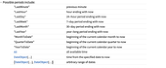 "LastMinute" previous minute "LastHour" hour ending with now "LastDay" 24-hour period ending with now "LastWeek" 7-day period ending with now "LastMonth" 30-day period ending with now "LastYear" year-long period ending with now "MonthToDate" beginning of the current calendar month to now "QuarterToDate" beginning of the current calendar quarter to now "YearToDate" beginning of the current calendar year to now All all available time DateObject[…] time from the specified date to now {DateObject[…],DateObject[…]} arbitrary range of dates - If no period is specified, an association is returned containing elements for "LastDay", "LastWeek", "LastMonth", and All.