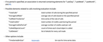 "TotalCalls" total number of calls during the specified period "AverageCallRate" average rate of calls based on the specified period "CallRateTimeSeries" time series of the rate of calls "TotalCredits" total number of credits used during the period "AverageCreditsPerCall" average number of credits used per call "CalledObjectsCount" count of times each cloud object is called "CallDetails" list of details for every call made - Other options include: